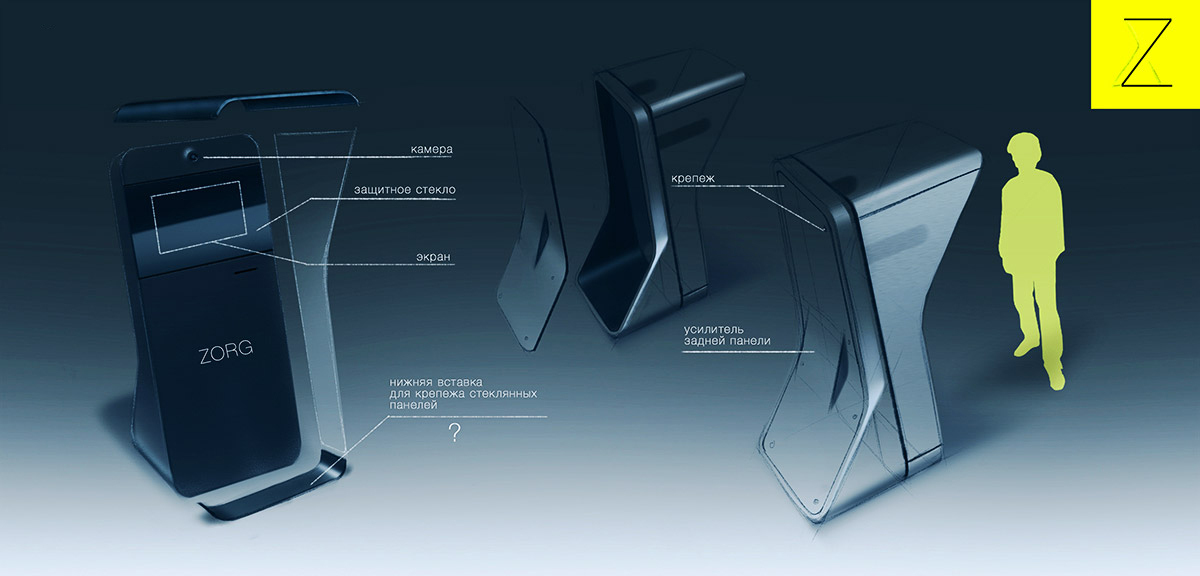 Киоск, дизайн которого сотрудники Zorgtech доверили разработать Формлабу, несет в себе интересное сочетание двух привычных форм обслуживания клиентов: удаленного — через портал самообслуживания — и личного (физического) взаимодействия с посетителем банковского офиса. Представьте, что клиент банка вместо того, чтобы стоять в очереди к одному из служащих, просто подходит к терминалу Zorgtech и с его помощью спокойно общается с банковским оператором. При необходимости он может предъявить паспорт, отсканировать его, получить распечатанный бланк договора и подписать его, вернув в терминал.