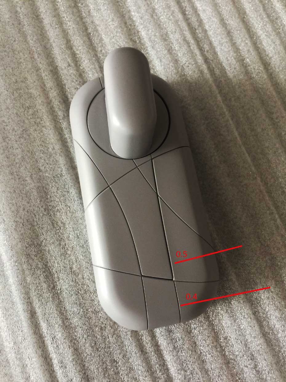 Он далеко не идеален (есть нестыковки линий, виден зазор в районе крышки батарейного отсека), но в любом случае качество этого прототипа гораздо лучше, чем напечатанного на принтере макета. То есть такой несовершенный прототип позволил отработать многие узлы и узнать, что ещё нужно скорректировать в корпусных элементах.